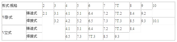 我公司雙螺桿泵分立式、臥式兩大類,規(guī)格有2,3,4,5,6,7,7T,8,9,10共10個(gè),其品種與規(guī)格的型號(hào)組合見下表: